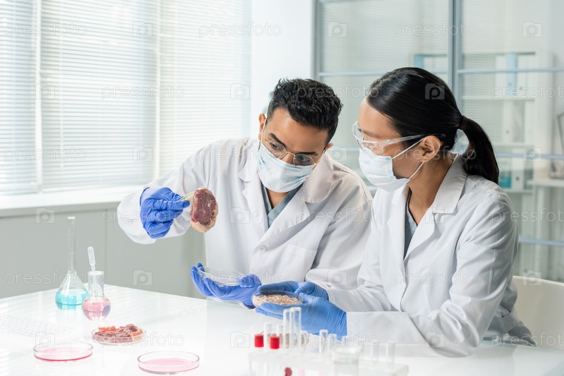 Два молодых межкультурных исследователя или клинициста, изучающих особенности сырого мяса