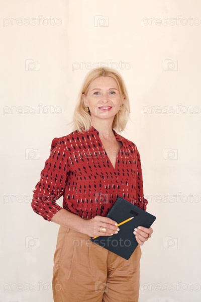 Зрелая жизнерадостная деловая женщина в умной повседневной одежде, держащая блокнот и карандаш