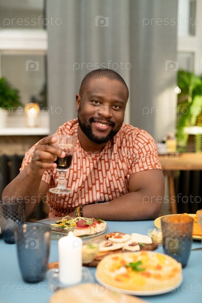 Счастливый молодой африканский мужчина, радующийся бокалом красного вина перед камерой