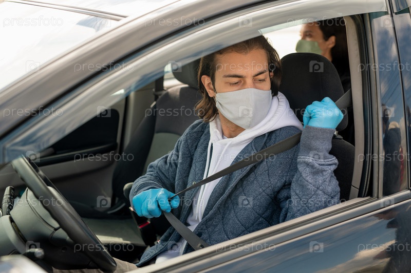 Молодой человек в перчатках и маске собирается пристегнуть ремень безопасности, сидя в машине
