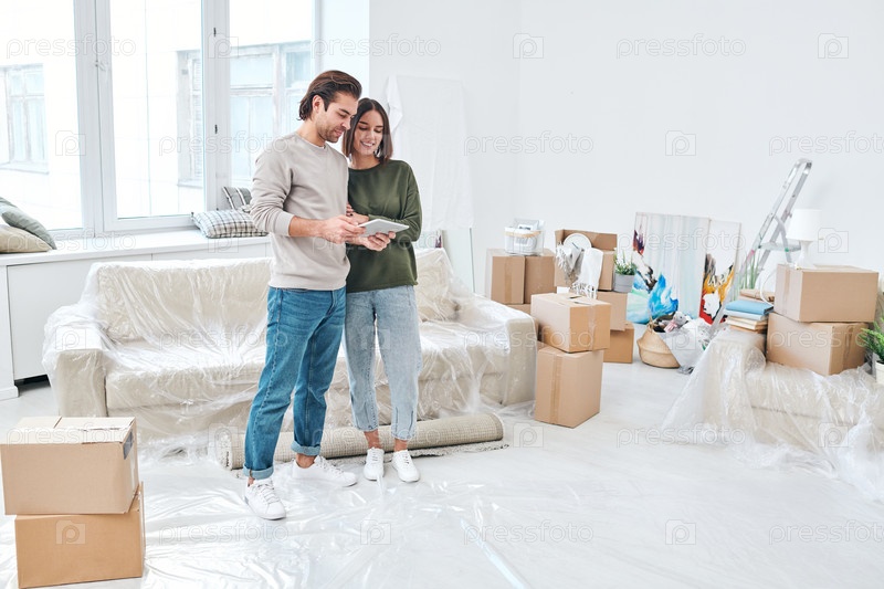 Молодая случайная пара с планшетом стоит у дивана и заказывает пиццу онлайн