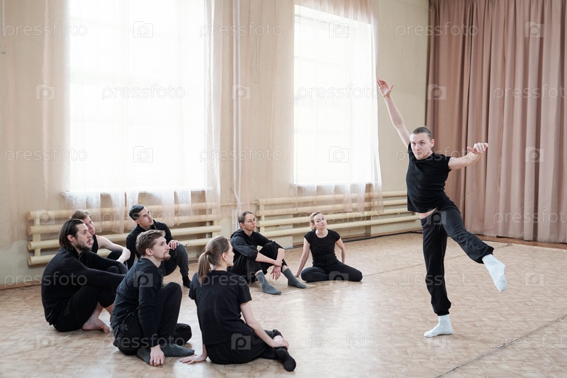 Активный молодой человек показывает танцевальные упражнения группе студентов во время тренировки