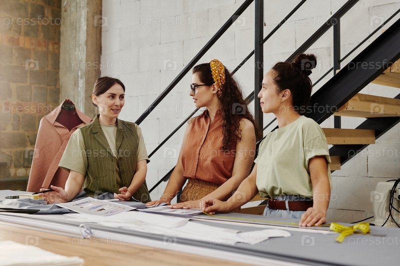 Две молодые курсантки показывают тренеру по пошиву новые эскизы модных предметов