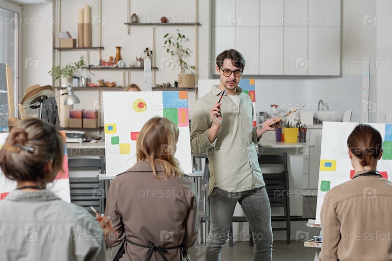 Молодая самоуверенная учительница курса живописи стоит перед аудиторией