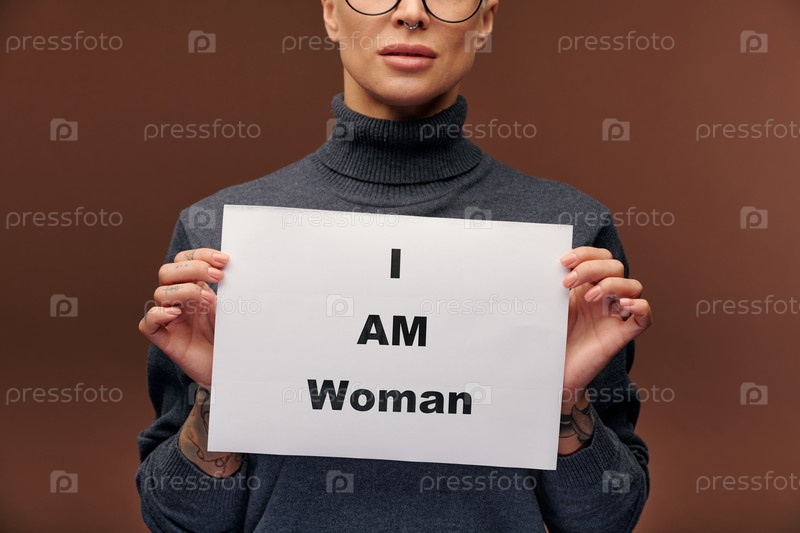 Передняя часть женского пола с татуировками, показывающими бумагу, на которой написано, что она женщина