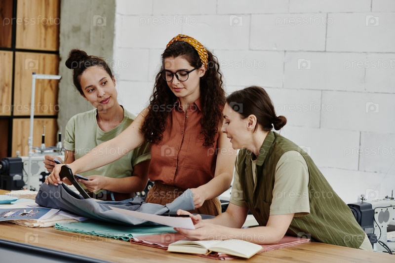Три модных дизайнера смотрят на незавершенную серую куртку из новой коллекции