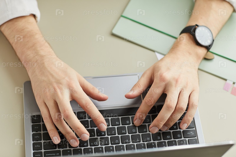 Близкий снимок мужских рук, печатающих на ноутбуке