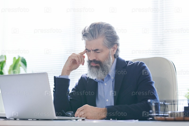 Усталый или задумчивый старший мужчина с седой бородой и волосами, касающимися храма