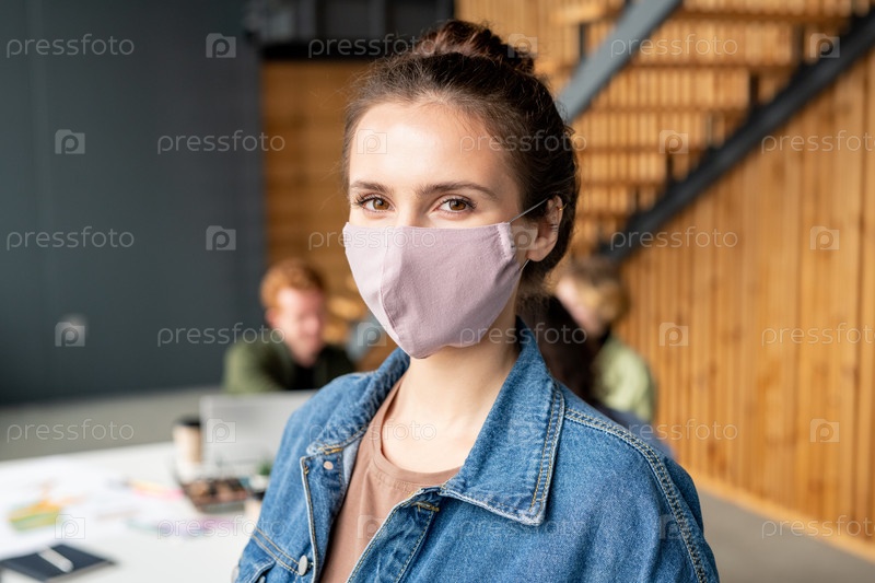Молодая бизнес-женщина с темными волосами и коричневыми глазами стоит перед камерой