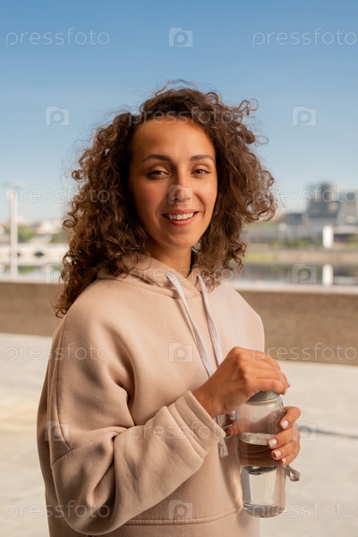 Молодая улыбающаяся спортсменка в активной одежде пьет воду после тренировки на свежем воздухе
