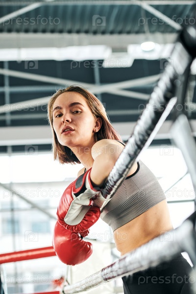 Красивая молодая самоуверенная женщина в спортивной одежде и боксерских перчатках стоит у баров