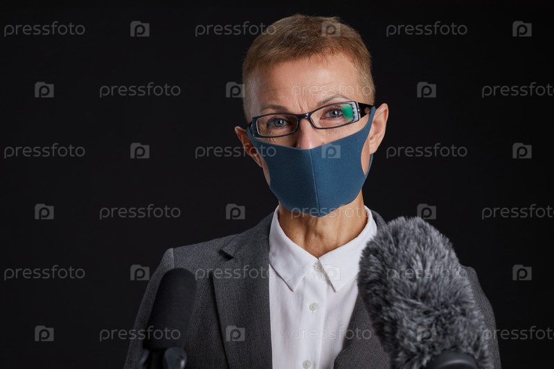 Зрелая женщина в маске, разговаривающая с микрофоном