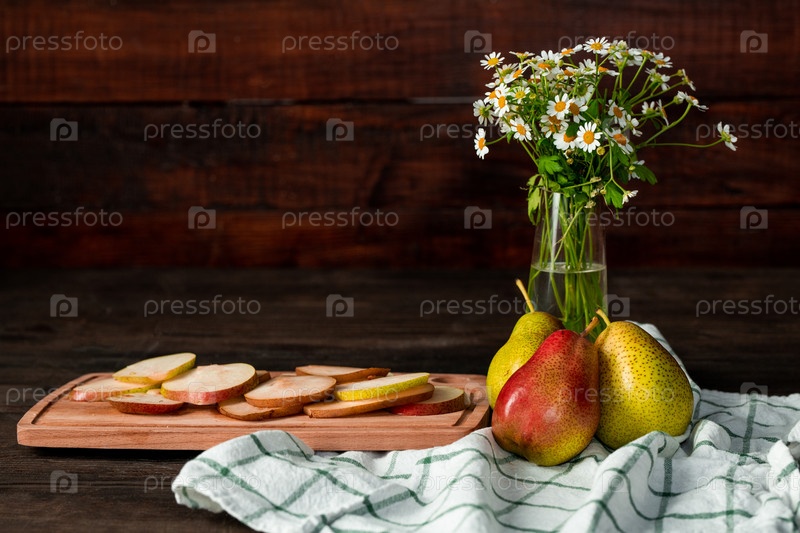 Ваза с дикими цветами, льняное полотенце, спелые садовые груши и кусочки свежих фруктов