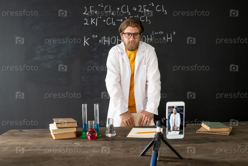 Учитель химии в белом халате стоит у доски перед смартфоном