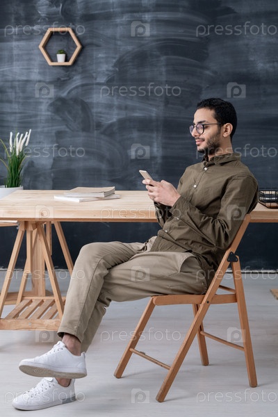 Серьезный парень сидит на стуле у деревянного стола в офисе, используя смартфон