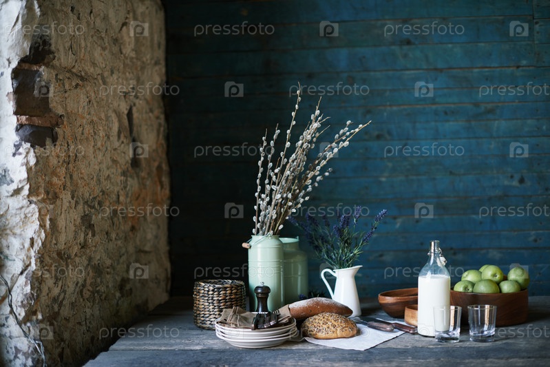 Натюрм сервируемого стола с домашним хлебом, свежим молоком и яблоками