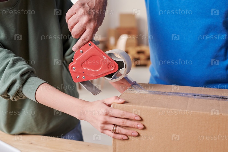 Ближайшее изображение неузнаваемых почтовых работников, упаковывающих посылки вместе с помощью эластичной ленты