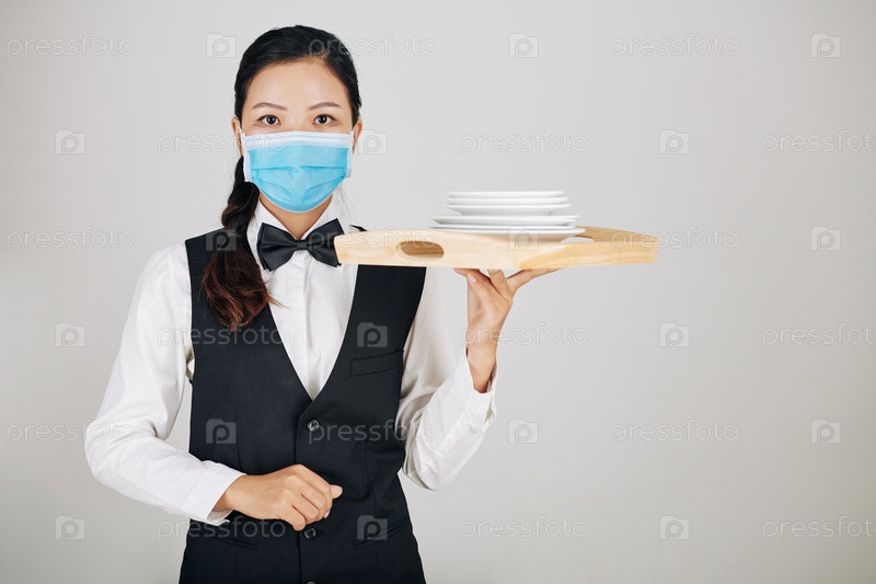 Официантка, несущая деревянный поднос