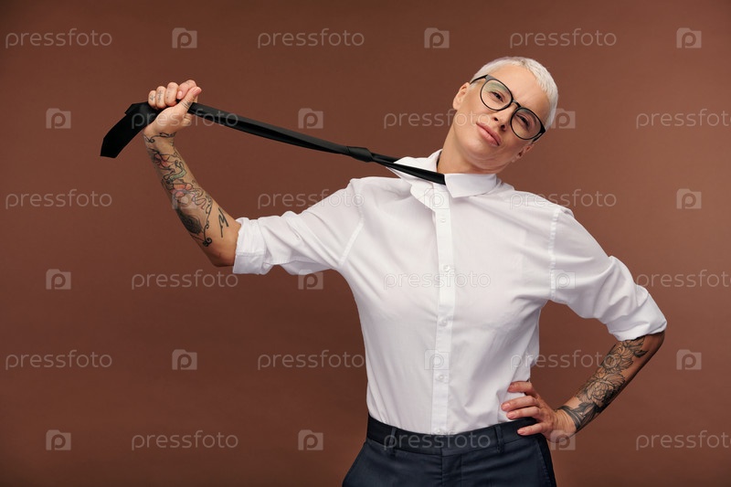 Зрелая блондинка-бизнесwoman с руками, покрытыми татуировками, растягивая черный галстук
