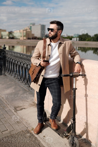 Молодой человек в элегантной стильной повседневной одежде и солнцезащитных очках стоит на берегу реки