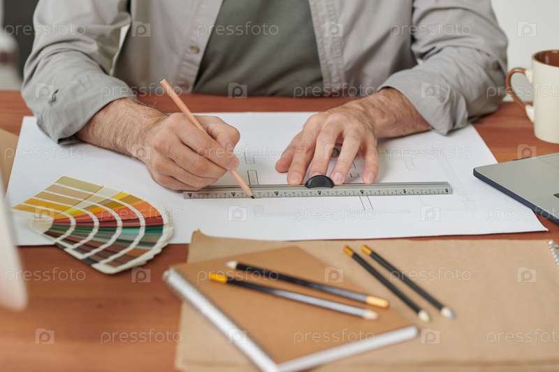 Близкий план неузнаваемого дизайнера квартир в рубашке, сидящего за столом и рисующего эскиз с помощью линейки