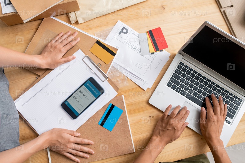 Руки молодых менеджеров, использующих мобильные гаджеты при получении онлайн-платежей