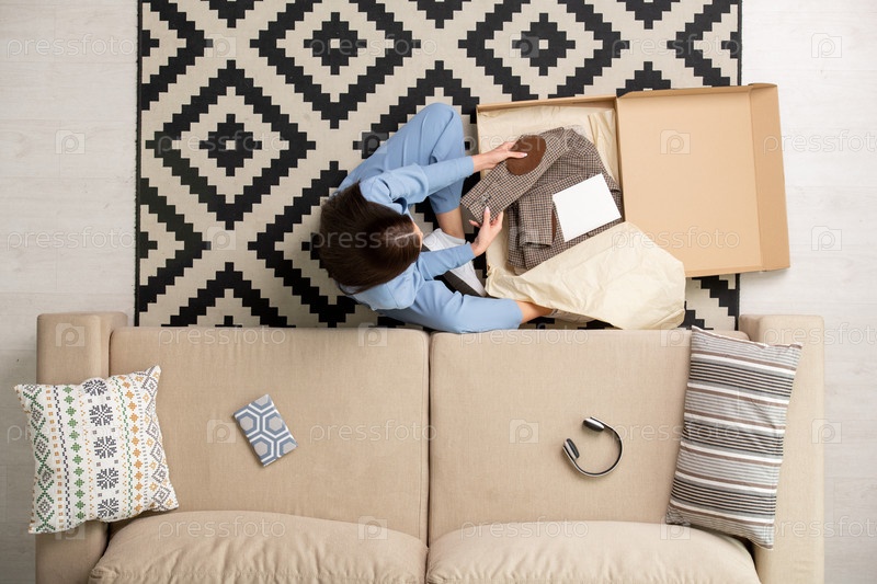 Вид брюнетной девушки, глядящей на новую сложенную квадратную куртку из интернет-магазина