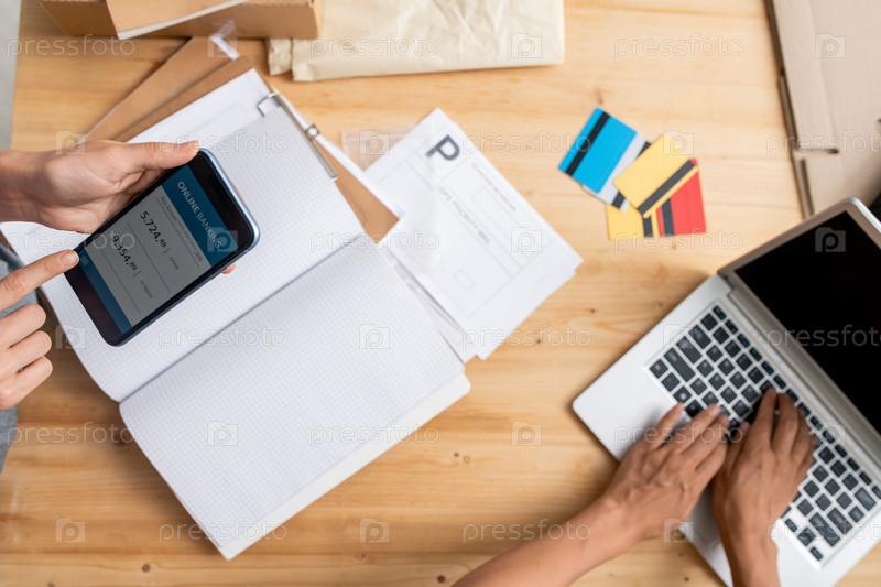 Вид на руки молодых женщин-менеджеров, принимающих онлайн-платежи клиентов