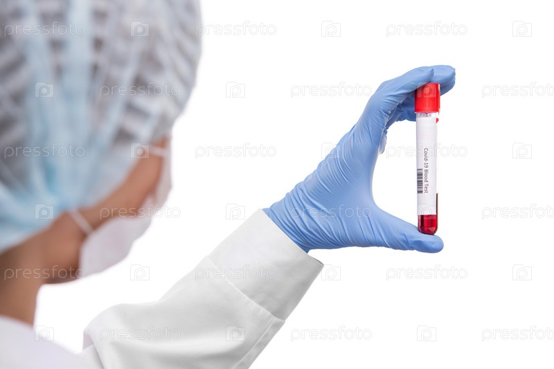 Перчатковая рука женщины-вирусолога в маске и белом халате, держащей анализ крови