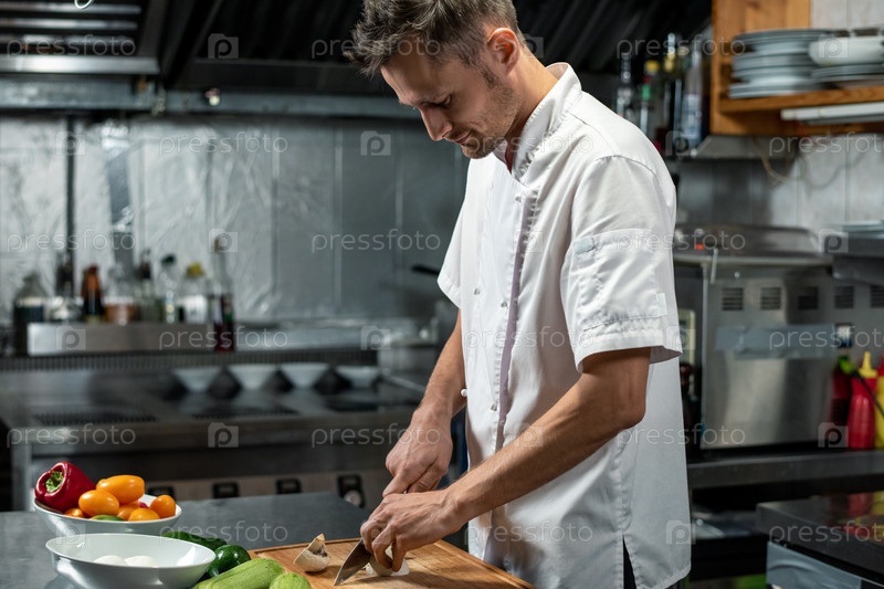 Молодой профессиональный шеф-повар современного ресторана в униформе режет овощи