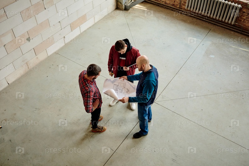Группа молодых современных инженеров обсуждает эскиз в черновике