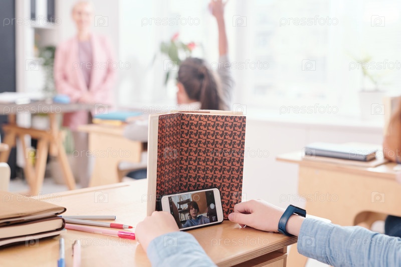 Руки современного школьника за столом, притворяющегося читающим книгу