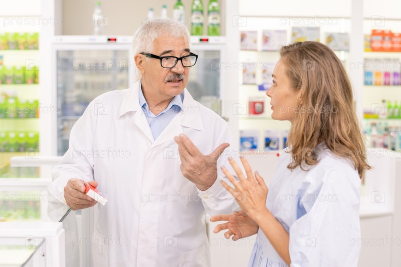 Старший фармацевт-мужчина держит новые лекарства во время консультации со своим помощником
