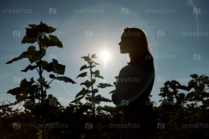 Силуэт молодой женщины, стоящей перед камерой среди подсолнечников