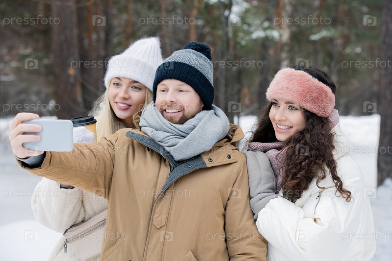 Группа счастливых девушек и парень в зимней одежде делают селфи на смартфоне в парке