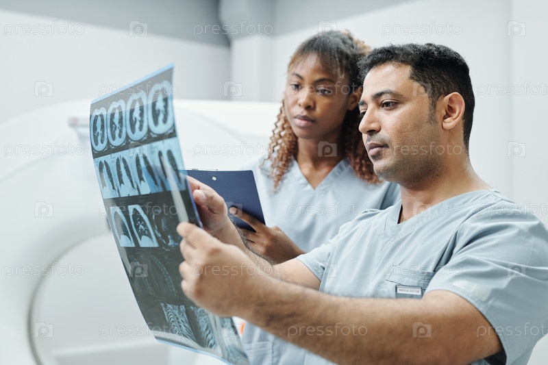 Радиолог смешанной расы и его африканская ассистентка анализируют рентгеновское изображение