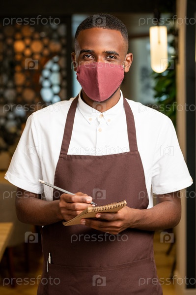 Счастливый молодой африканский мужчина в коричневом фартуке и защитной маске принимает приказы