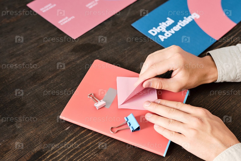 Руки молодого офисного менеджера, сидящего за деревянным столом и берущего розовую бумагу