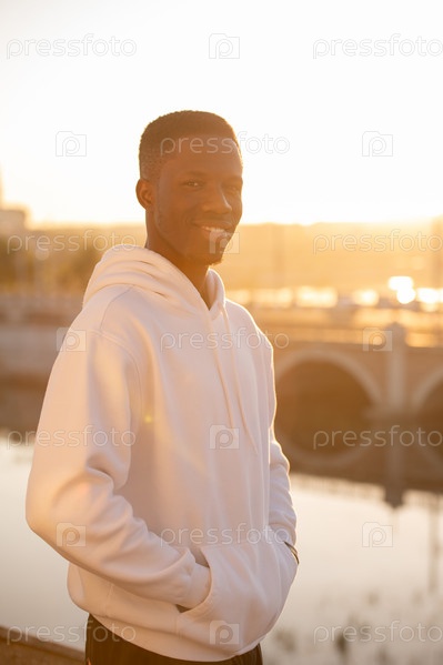 Счастливый молодой африканский мужчина в белой толстовке с капюшоном, держа руки в карманах