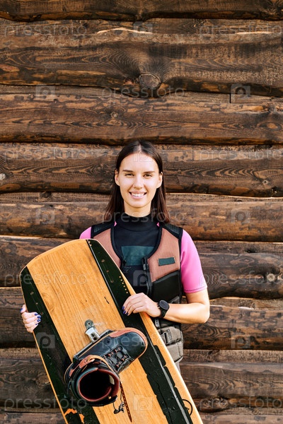Активная молодая женщина-серфер в защитном жилете, держащая доску для серфинга и смотрящая на тебя