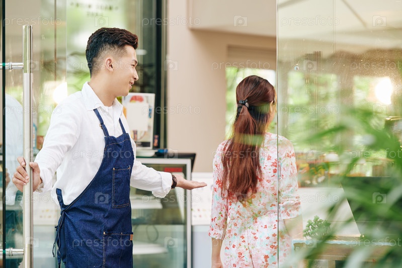 Официант кафе, приветствующий клиента