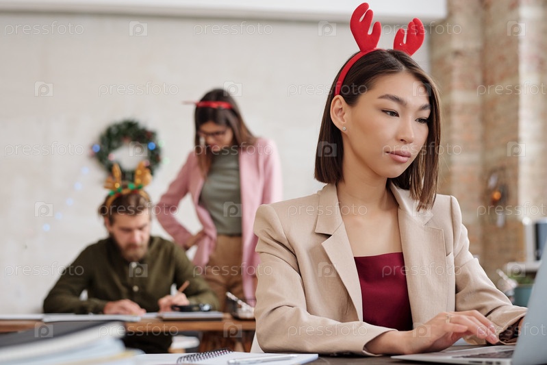 Молодая красивая азиатская менеджерка в сети против коллег, планирующих работу по столу