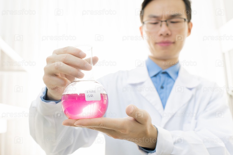 Ученый держит бутылку с жидкостью