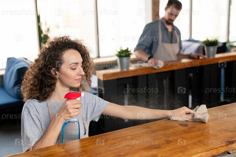 Молодая хозяйка ресторана распыляет моющее средство на стойке в баре