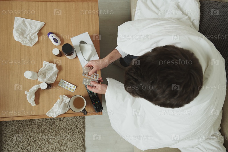 Обзор больного человека, завернутого в одеяло и выбирающего какую таблетку принять
