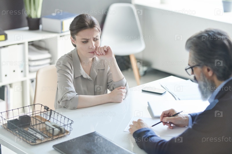 Молодая задумчивая соискательница, сидящая у стола перед старшим работодателем