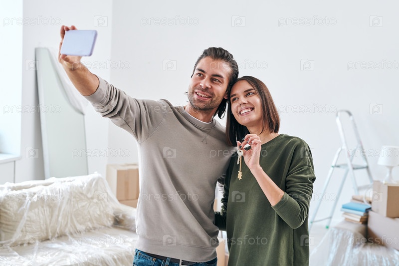 Молодой человек со смартфоном делает селфи со своей счастливой женой, держащей ключ
