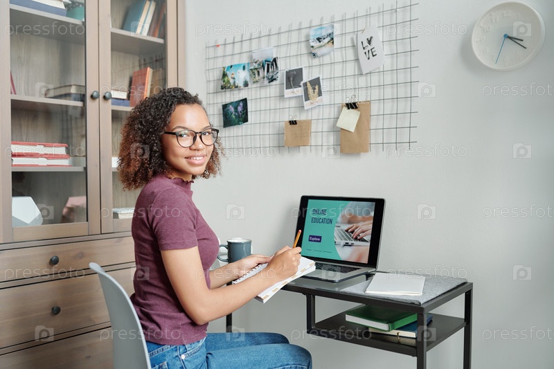 Молодая веселая студентка в повседневной одежде делает заметки перед ноутбуком