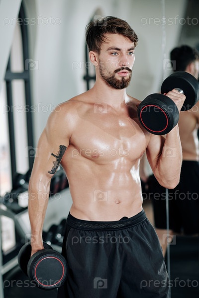 Без рубашки мужчина занимается бицепсом