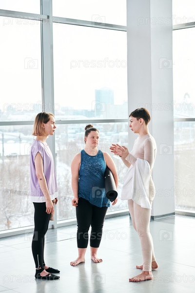 Две девушки в спортивной одежде слушают своего инструктора по фитнесу или йоге